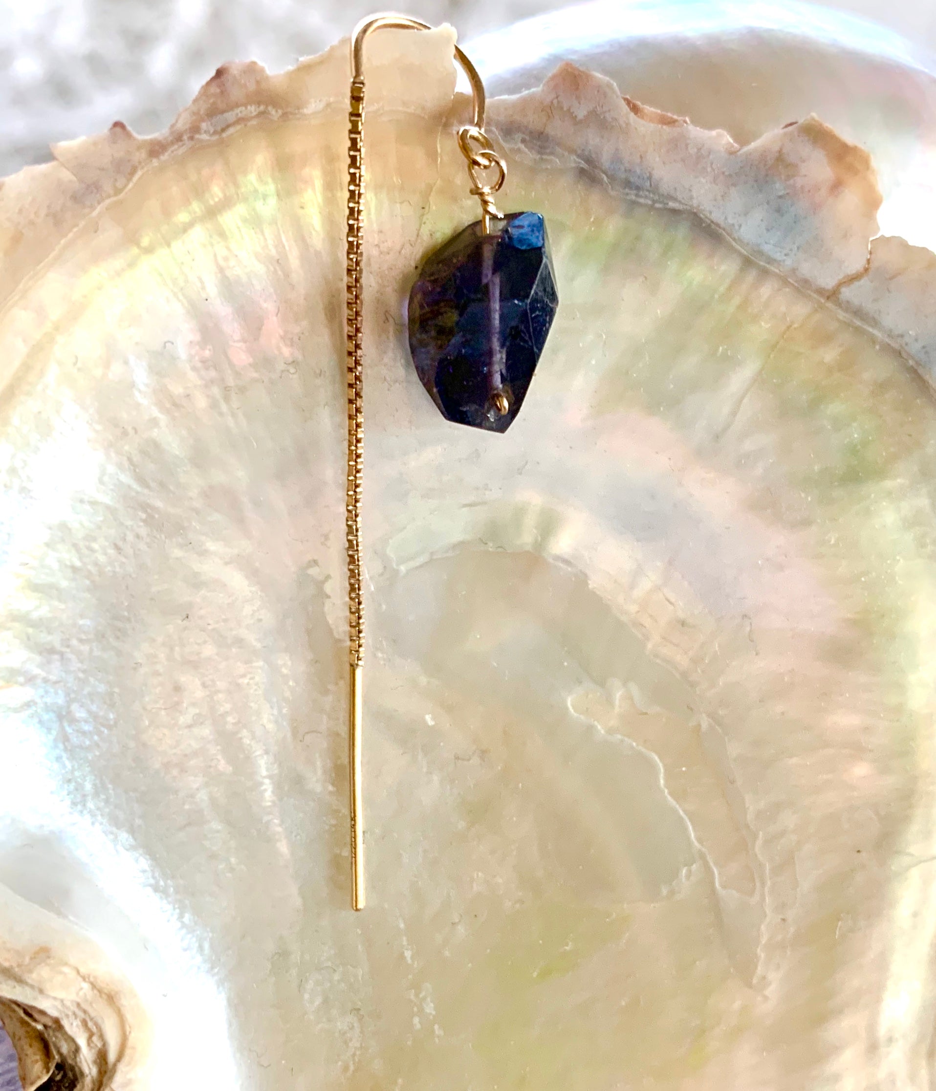 Pendientes de hilo rellenos de oro de 14 quilates con iolita azul profunda tallada en faceta áspera y cruda