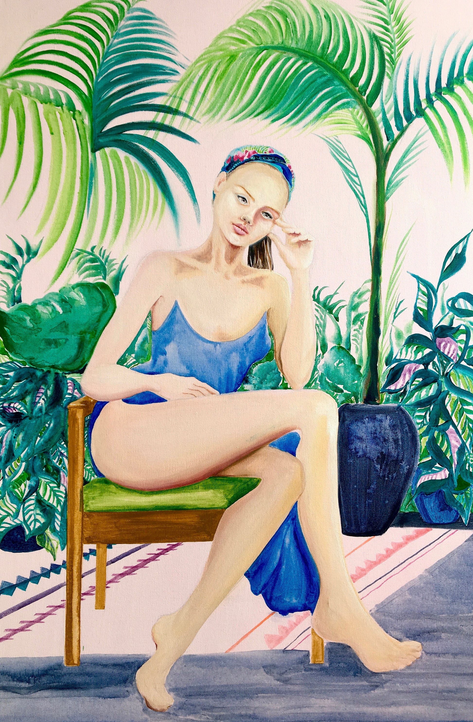 Impresión artística original de una niña sentada entre plantas tropicales. Impresión de bellas artes con calidad museística utilizando tintas de archivo sobre papel de trapo de algodón de 300 g/m².