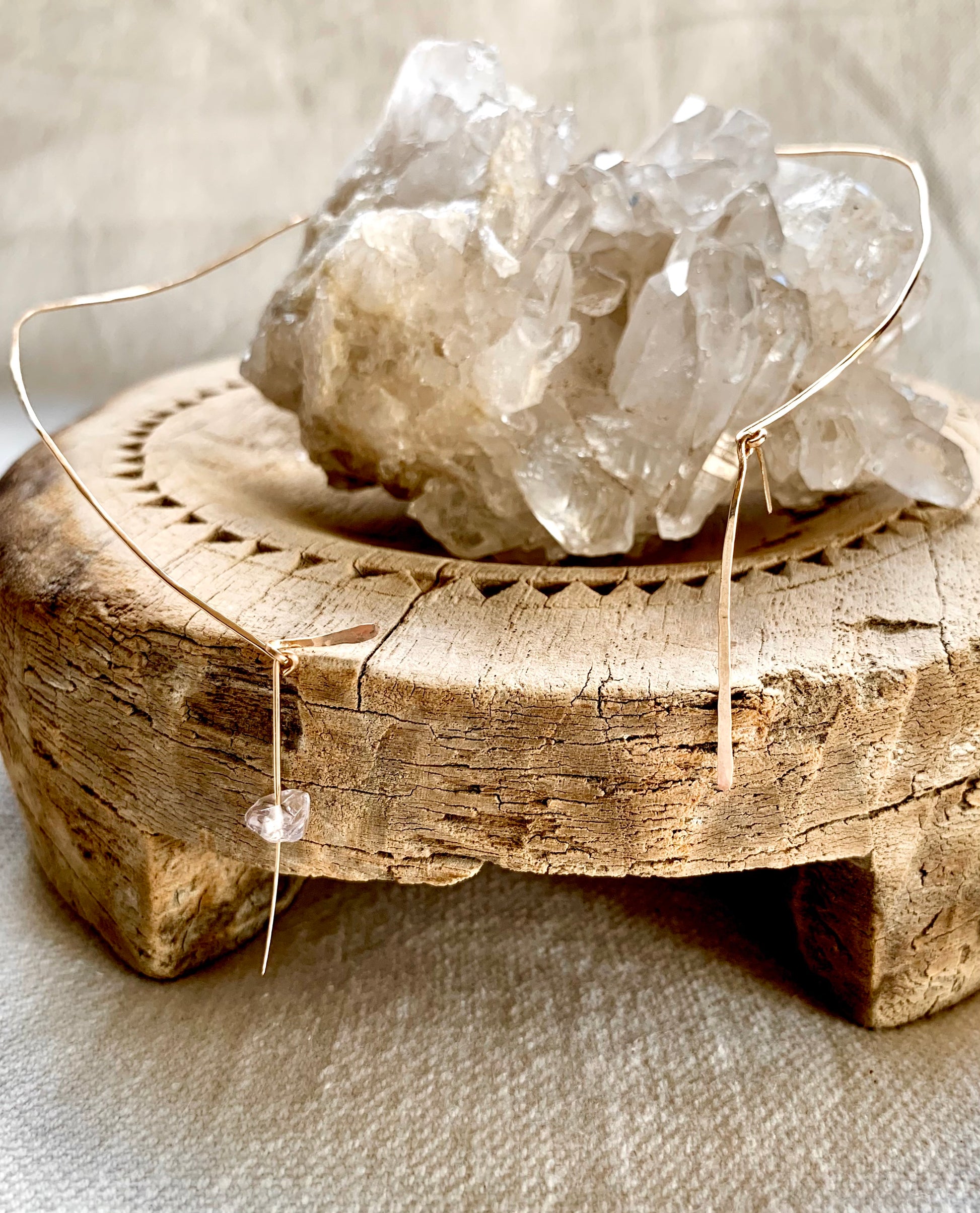 Elegant minimalist asymmetrical choker necklace with hammered finish. Each end finished with a 3.5cm drop with one featuring a natural clear crystal quartz chip. Necklace is one size fits all; gently stretch or tighten choker to fit your neck.