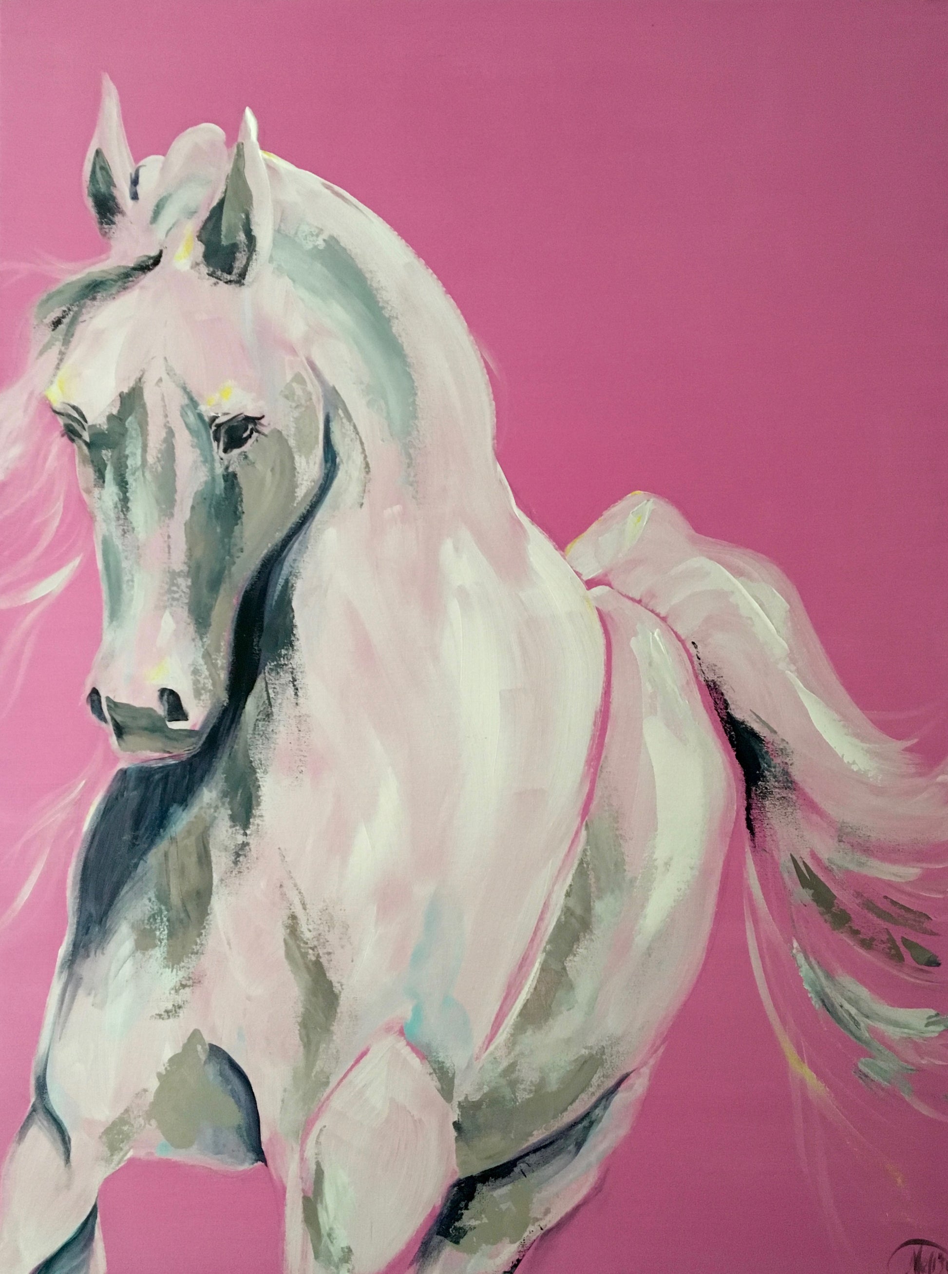 Original art print of white horse, with pink background. Museum quality fine art print using archival inks on 300gsm cotton rag paper.
