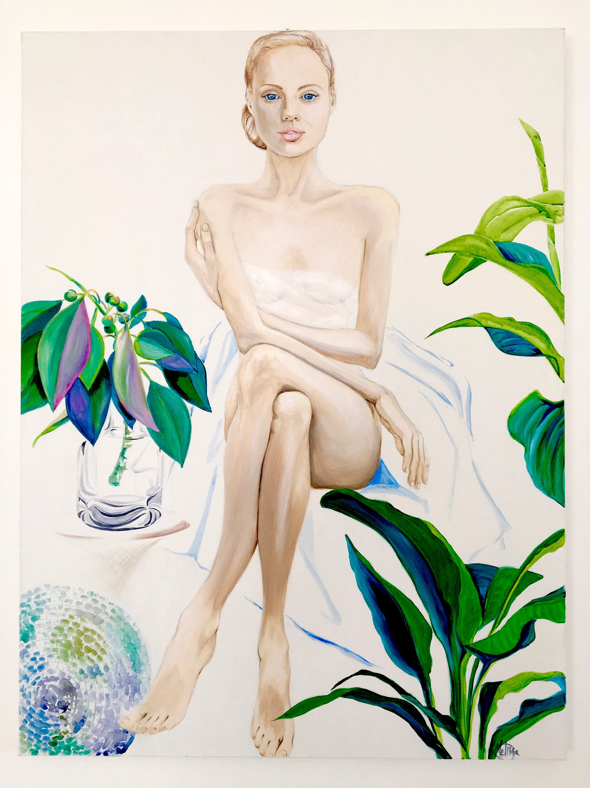 Original art print of girl sitting on bed amongst plants & mirrorball. Museum quality fine art print, using archival inks on 300gsm cotton rag paper.